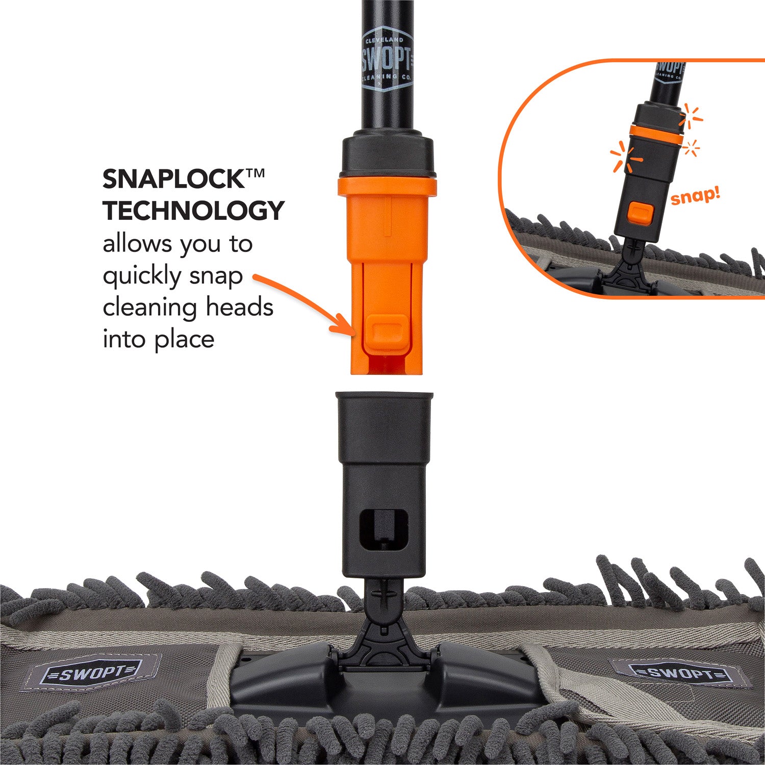 The SWOPT™ Indoor Cleaning Kit is part of the SWOPT™ Cleaning’s interchangeable cleaning system. The cleaning kit includes the SWOPT™ 11 in. Standard Multi-Surface Angle Broom Head, the SWOPT™ 12 in. Microfiber Dust Mop Head, and the SWOPT™ large plastic dust pan. The 11 in. angle broom head is designed to maneuver around furniture and in corners as it sweeps to pull dirt from hard-to-reach places. It features medium-stiff bristles that efficiently trap dirt and debris from surfaces of all kinds. The 12 in. microfiber dust mop head features a dual action microfiber cleaning pad that picks up dust and pet hair in hard-to-reach areas and is great for use on wood, laminate, and tile floors. It is machine washable and reusable. The plastic dust pan efficiently sweeps up dirt and debris. It is a great kit for indoor applications. Thanks to innovative SNAPLOCK™ Technology, each of the brush heads can be ‘SWOPT’ with the push of a button and attached to any of our SWOPT™ handles, which do not twist loose due to patented technology. Take back your closet with SWOPT™ by using one SWOPT™ handle with multiple cleaning heads and save money and space in your home! Our products are sleek and stylishly designed. Additionally, SWOPT™ products are manufactured and packaged with sustainability and reusability in mind in an effort to contribute to a more eco-friendly planet. Handle sold separately.